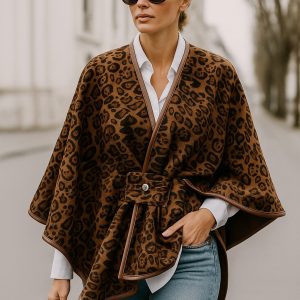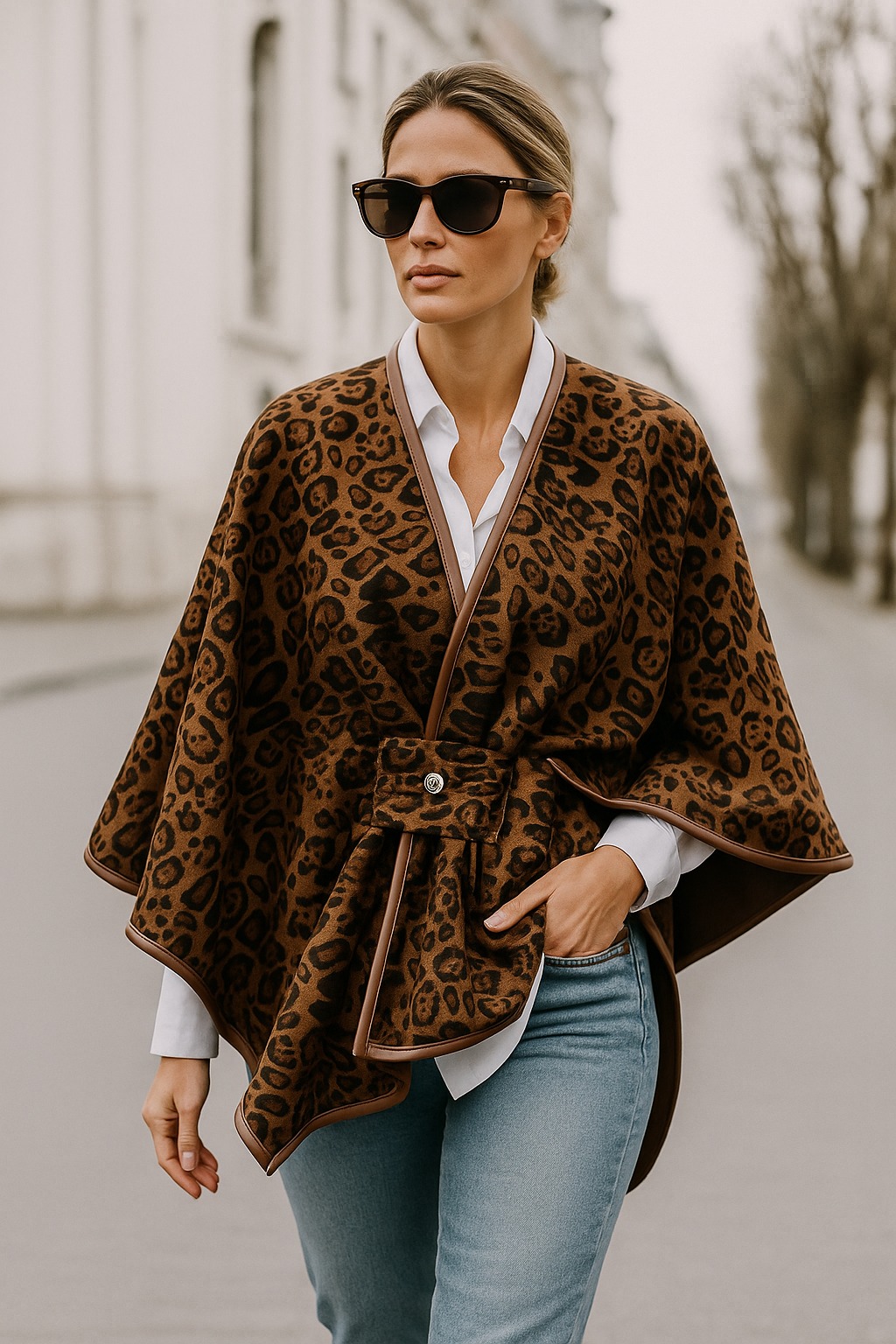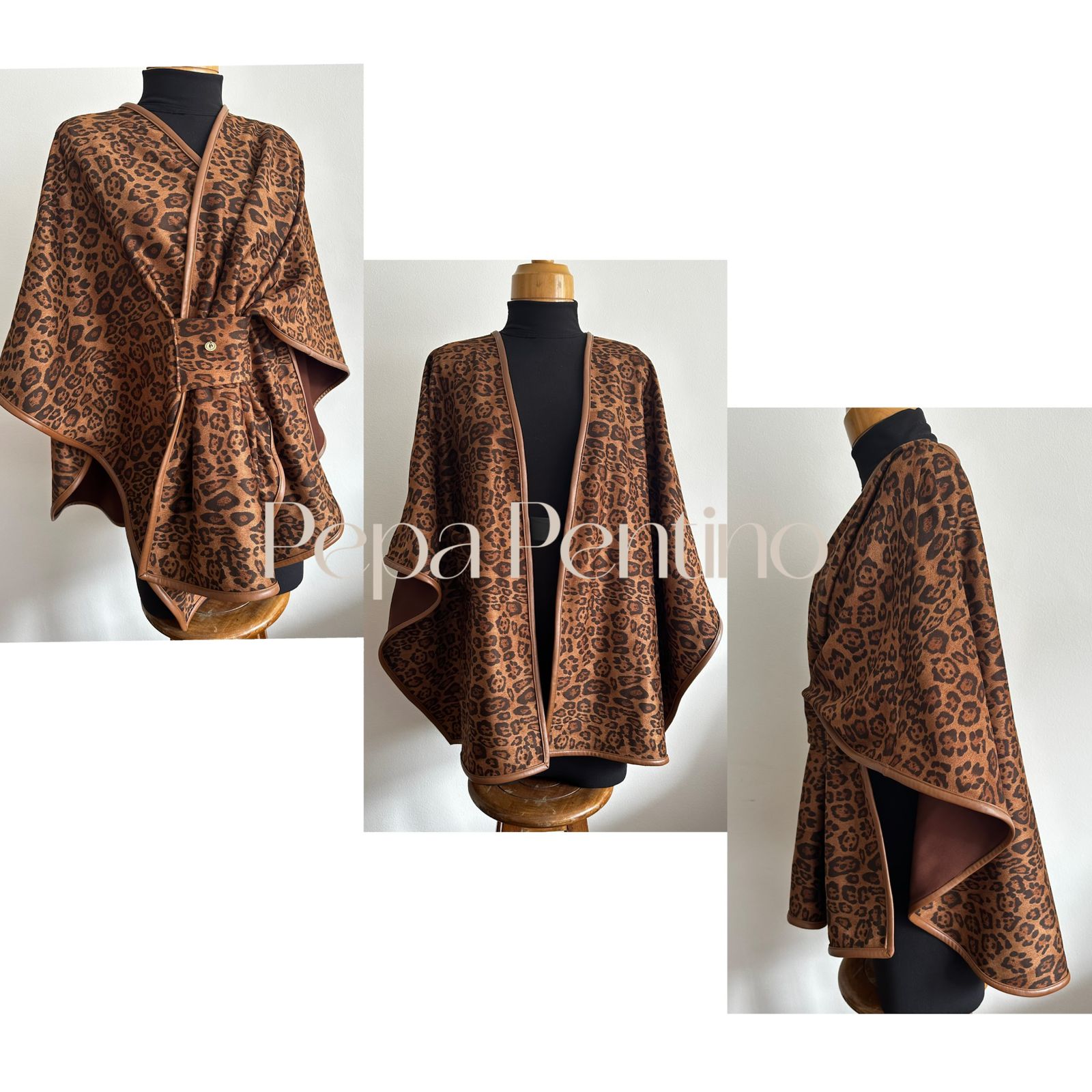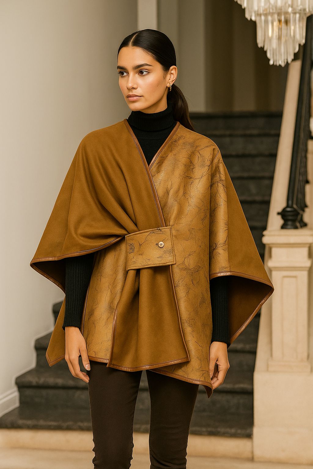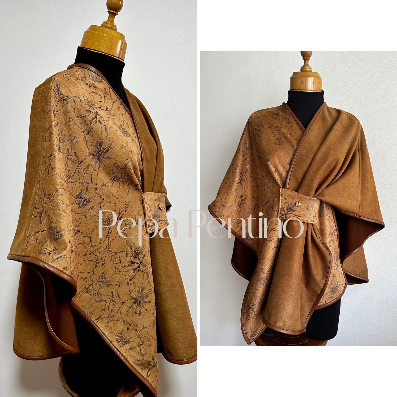 Capa tipo poncho en textura piel de durazno, con detalles bordados y detalles efecto cuero.