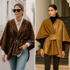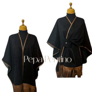 Capa tipo poncho en textura piel de durazno, con detalles bordados y detalles efecto cuero.