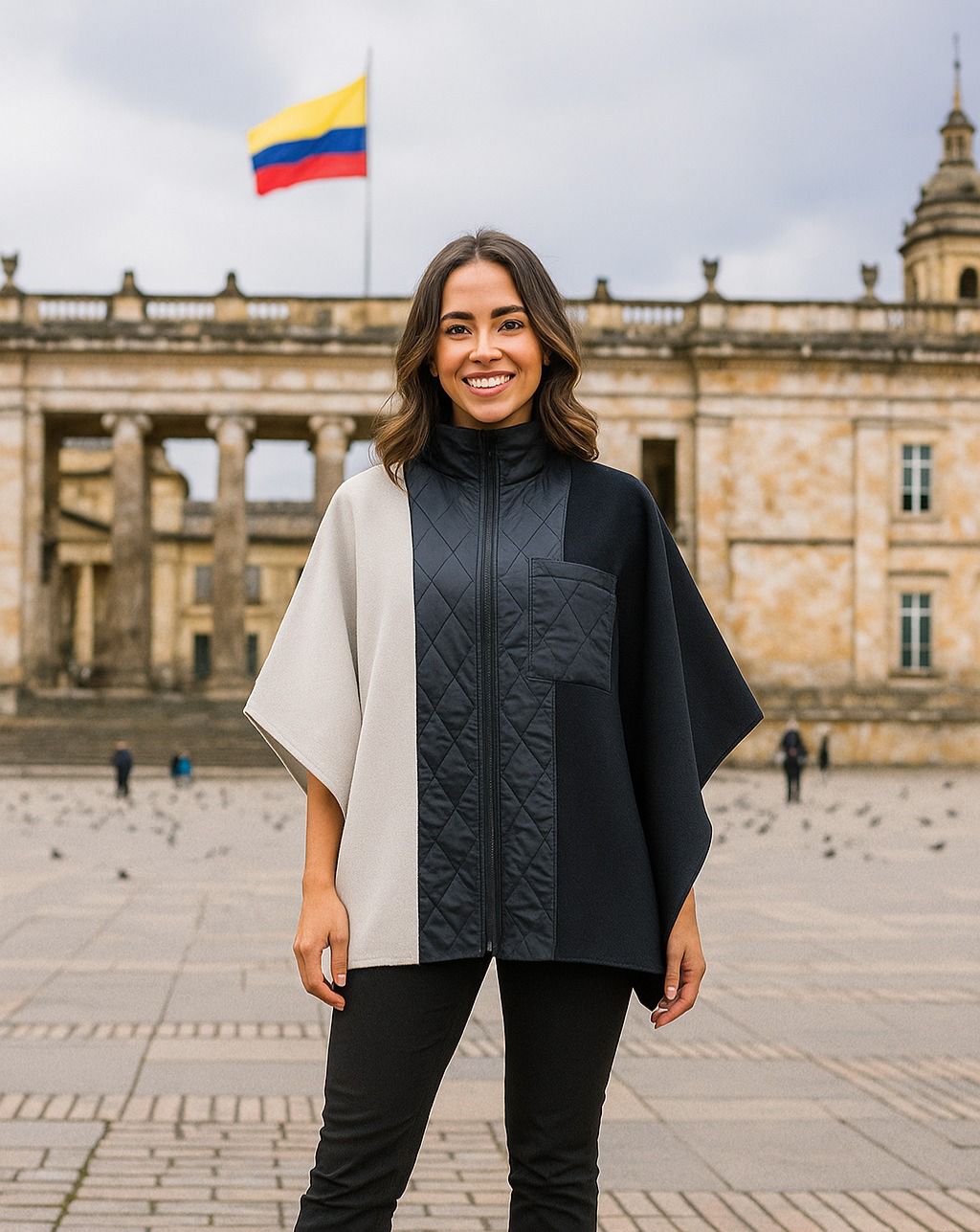 Diseño tipo poncho con cuello alto. Elaborada en paño poliéster a 2 tonos y detalles en material impermeable.