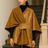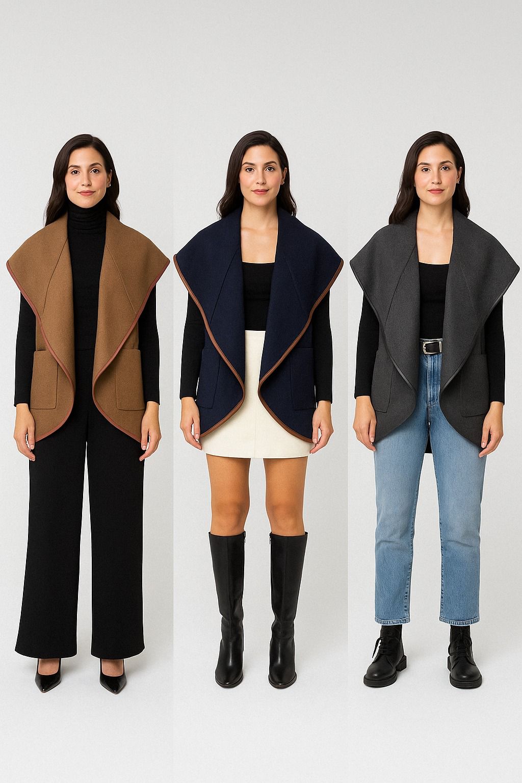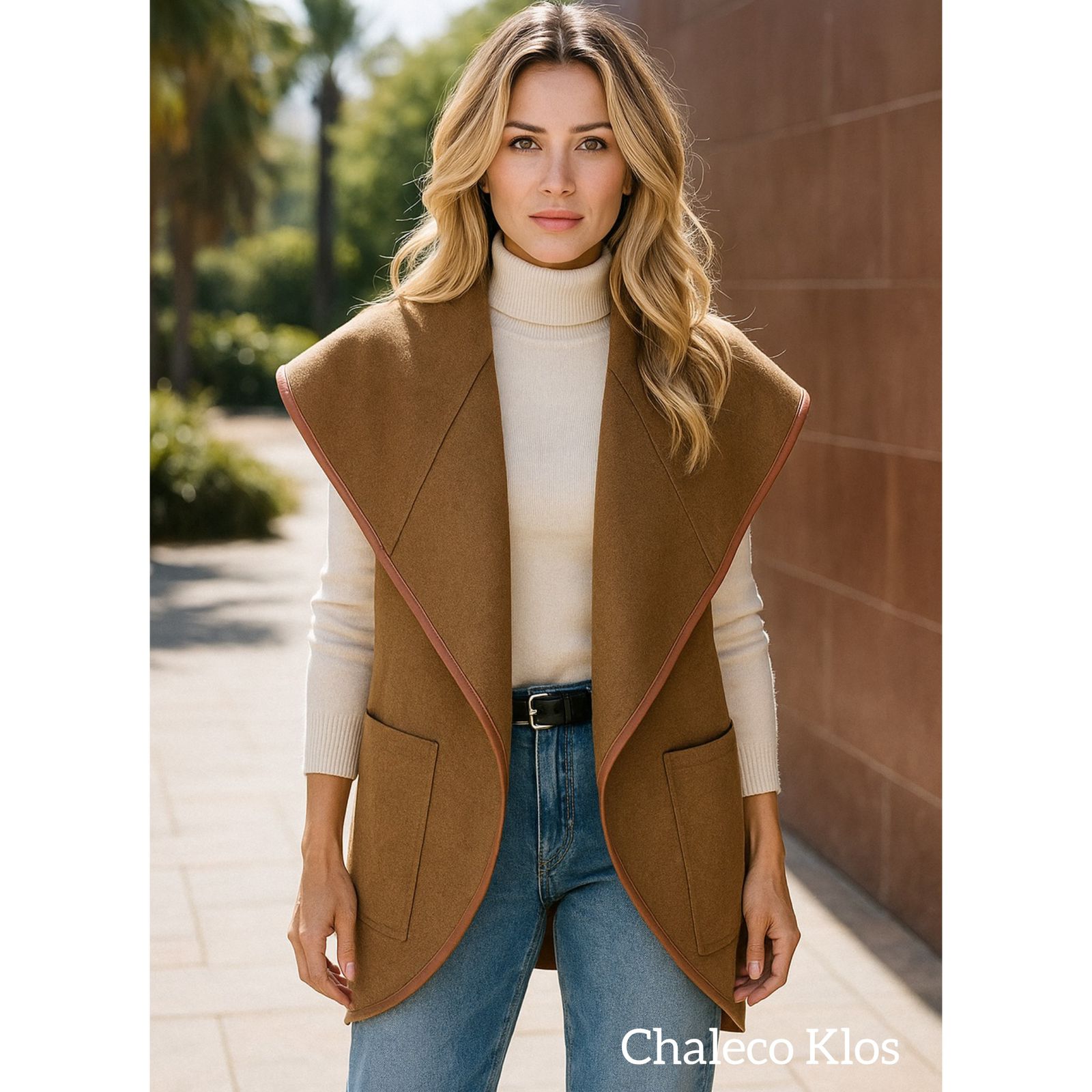 Chaleco en paño y detalles efecto cuero, con solapa cuello amplio y bolsillos laterales